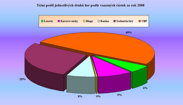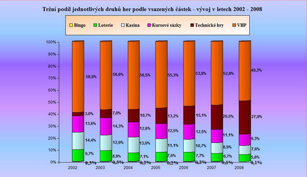 Největší podíl mezi provozovanými sázkovými hrami a loteriemi tradičně zaujímají výherní hrací přístroje. Celkový podíl VHP na vsazených částkách (podíl na trhu) však klesl oproti roku 2007 o 3,5 procentních bodů z 52,8% na 49,3%. Pokles podílu na trhu dlouhodobě vykazují i ostatní loterie a jiné podobné hry a to ve prospěch technických zařízení obsluhovaných přímo sázejícími, zejména ve prospěch interaktivních videoloterních terminálů. Podíl na trhu vzrostl u technických zařízení z 20,5% v roce 2007 na 27,9% v roce 2008. Oproti roku 2006 vzrostl podíl technických zařízení na trhu téměř na dvojnásobek. Zvyšování podílu technických zařízení na trhu loterií a jiných podobných her lze očekávat i v roce 2009.
