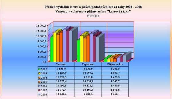 | Kursové sázky | 2002 | 9 538,6 | 8 336,9 | 1 201,6 | 54,5 | 148,7 | |