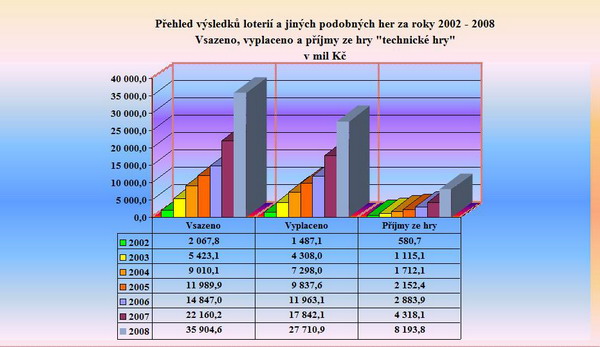 Nárůst sázek u technických zařízení činil 62%, tedy 13 744,4 mil. Kč (z 22 160,2 mil. Kč v roce 2007 na 35 904,6 mil. Kč v roce 2008).
