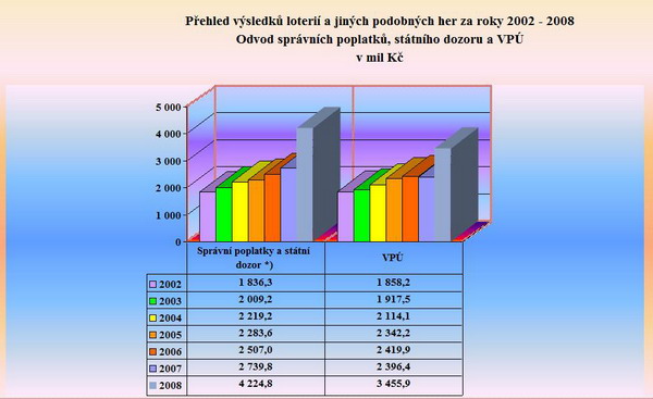 Do státního rozpočtu a rozpočtů obcí bylo formou správních poplatků, poplatků na státní dozor a místních poplatků odvedeno provozovateli loterií a jiných podobných her celkem 4 224,8 mil. Kč. Pro srovnání v roce 2007 tato částka činila včetně místních poplatků za výherní hrací přístroje 3 857,8 mil. Kč, meziroční nárůst činil 367 mil Kč, tj. 9,5%. Vykázaný odvod části výtěžku provozovatelů na veřejně prospěšné účely za rok 2008 činil 3 455,9 mil. Kč. To je o 44,2% více než v roce 2007. Nárůst odvodu části výtěžku na veřejně prospěšné účely je způsoben vyššími tržbami v oblasti výherních hracích přístrojů a technických zařízení.