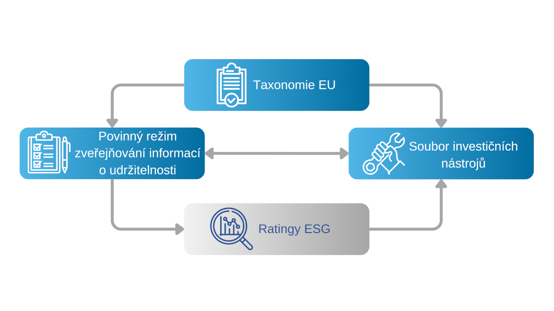 Jednotlivé pilíře rámce doplňují ratingy ESG, které poskytují hodnocení finančních nástrojů, finančních produktů nebo podniků. Tato hodnocení ovlivňují důvěru investorů v udržitelné produkty a v konečném důsledku fungování kapitálových trhů. (Více informací v sekci Ratingy ESG.)