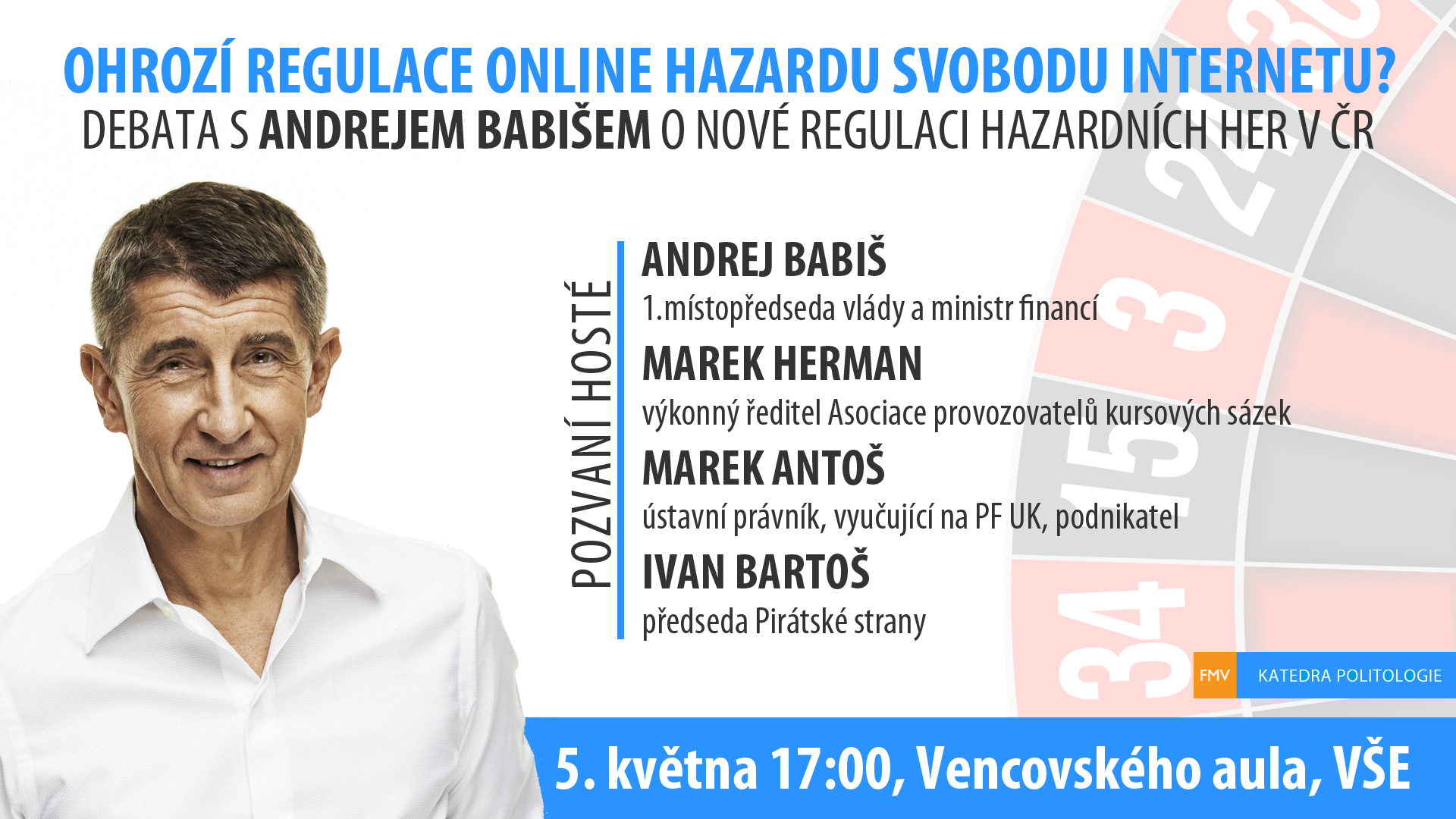Součástí nové regulace hazardních her v ČR je klíčové opatření umožňující blokaci nelegálních stránek s internetovým hazardem, které reaguje na současný neudržitelný stav na internetovém trhu sázkových her, který je na rozdíl od toho mimo-internetového doposud neregulovaný a nezdaněný. Toto opatření však v současné době vzbuzuje falešné obavy. Jedná se o cenzuru internetu nebo efektivní opatření? Je to zásah do práv uživatelů internetu? Je tím ohrožena svoboda slova? Tyto a jiné otázky zodpoví ministr financí Andrej Babiš a další hosté Katedry politologie Vysoké školy ekonomické:
