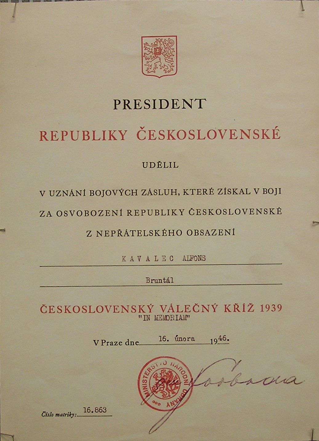 V únoru 1946 mu prezident Edvard Beneš udělil Československý válečný kříž 1939 in memoriam. Ještě téhož roku mu pak město Bruntál udělilo čestné občanství a pojmenovalo po něm tamější ulici.