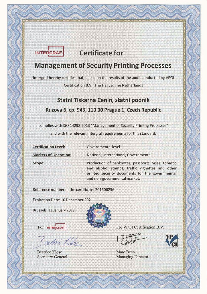 STÁTNÍ TISKÁRNA CENIN, státní podnik se po náročné přípravě a přísném certifikačním auditu společností VPGI Certification B.V. z Holandska v lednu 2019 stala držitelem certifikátu ISO 14298 – Řízení bezpečnosti tiskových procesů. Implementace ISO 14298 představovala výrazný zásah do fungování STÁTNÍ TISKÁRNY CENIN, státní podnik a vyžádala si rozsáhlé stavební úpravy a vybudování nového bezpečnostního systému na všech třech výrobních závodech. Certifikát od společnosti INTEGRAF je zárukou, že STC klade důraz na bezpečnost celého výrobního řetězce a potvrzuje dlouhodobý trend v STC v oblasti bezpečné výroby cenin a dokladů. V současné době je v České republice STC jedinou tiskárnou, která je držitelem tohoto certifikátu. Státní tiskárna cenin se tak hrdě řadí mezi světové špičky v oboru.