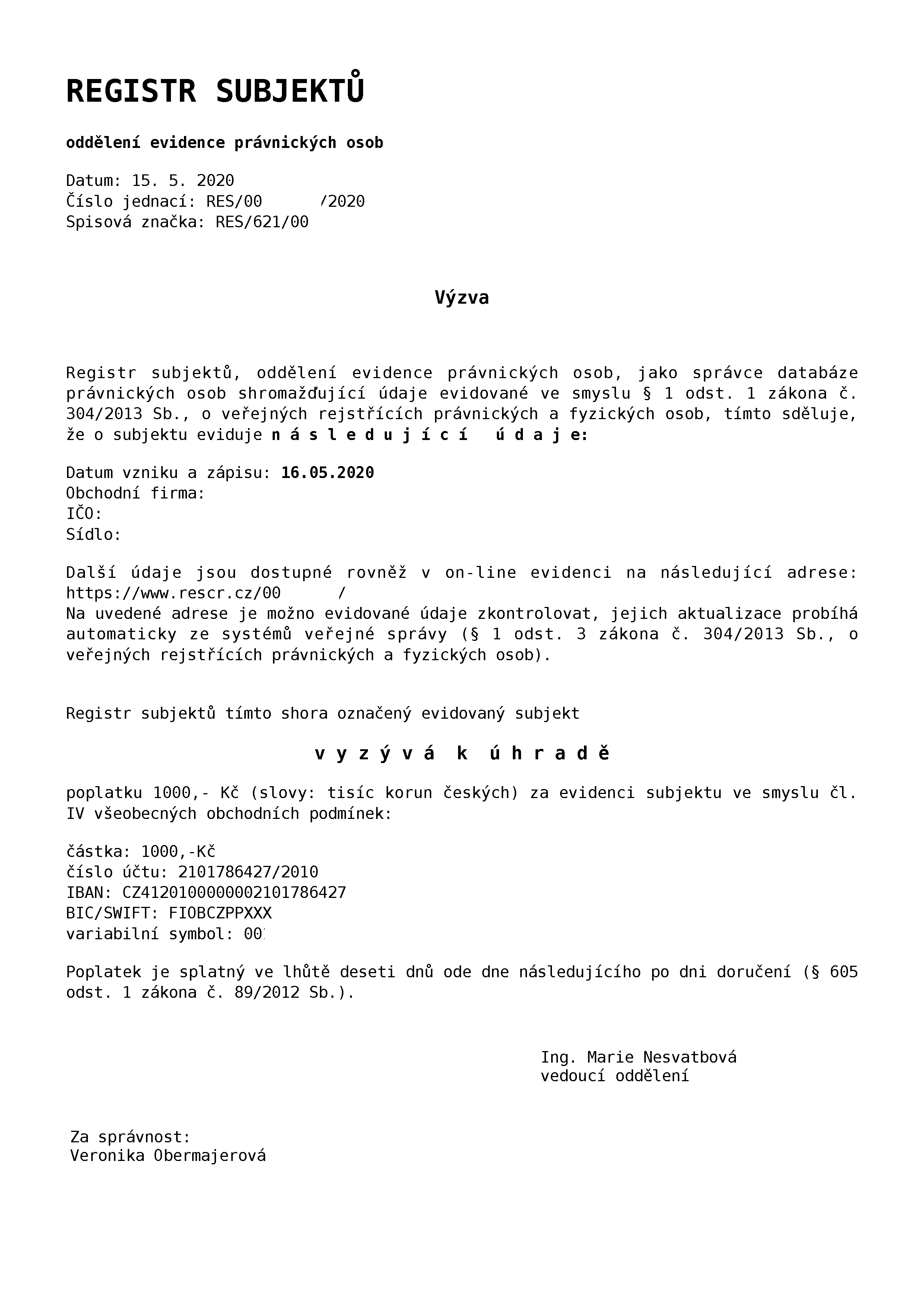 Zobrazení ekonomického subjektu v Administrativním registru ekonomických subjektů není spojeno s žádným poplatkem. Pokud jste se stali adresátem podvodné datové zprávy, nemusíte na zprávu reagovat či platit jakýkoliv poplatek.