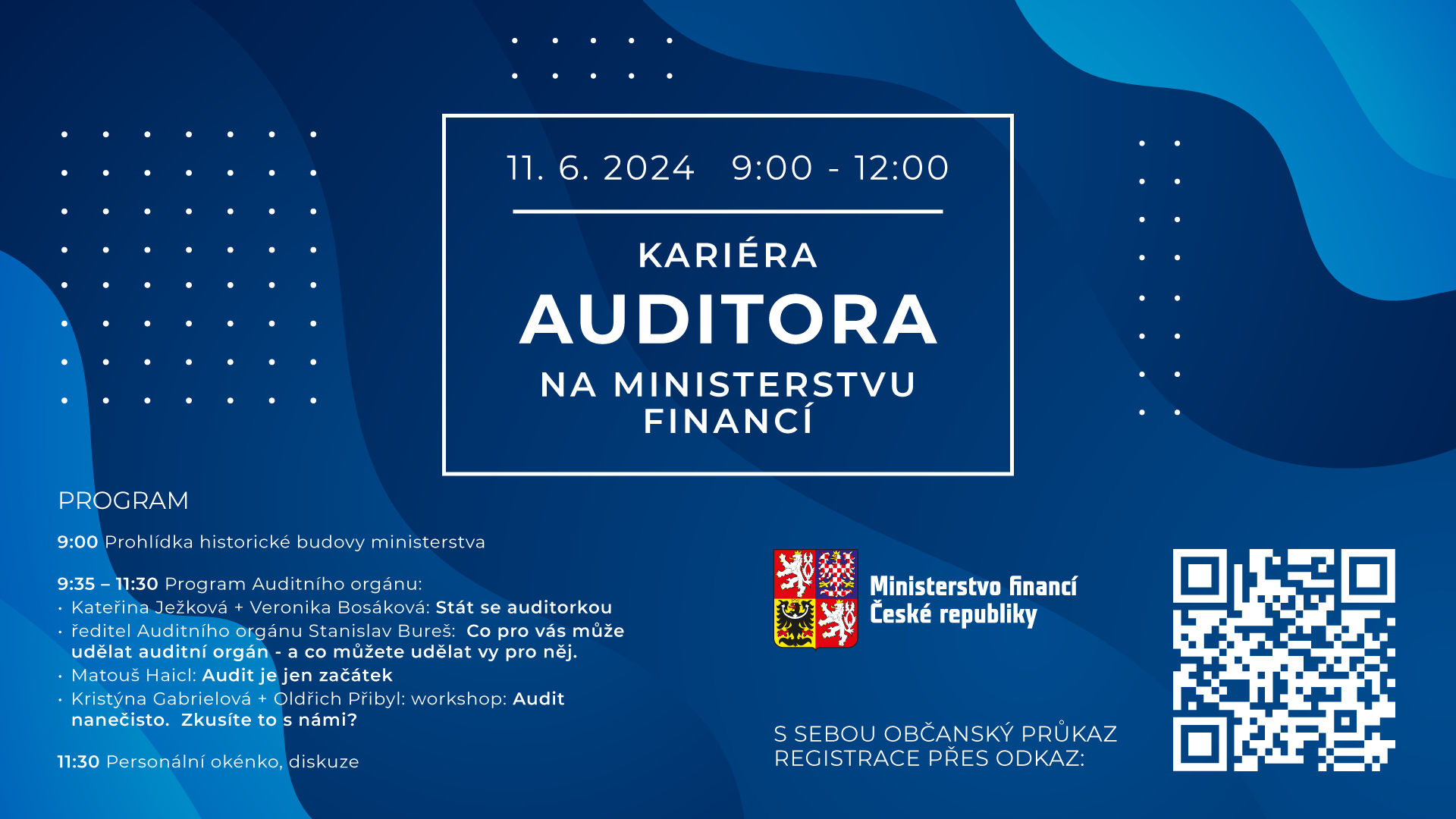 Přijďte se dozvědět více o roli a činnosti odboru Auditní orgán na Ministerstvu financí. Budete mít jedinečnou příležitost poznat různorodou náplň práce tohoto odboru, která zahrnuje nejen tradiční auditní činnosti, ale i inovativní projekty a postupy. Setkáte se s odborníky z praxe, kteří Vám představí, jaké to je pracovat jako auditor, jaké jsou výzvy a příležitosti této profese a jak můžete přispět k efektivnímu fungování státní správy. Tato akce je ideální pro studenty a absolventy, kteří zvažují kariéru v oblasti auditu a chtějí získat hlubší vhled do této profese.