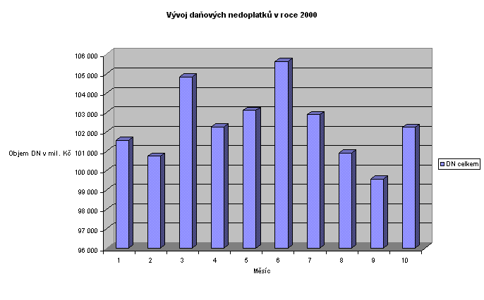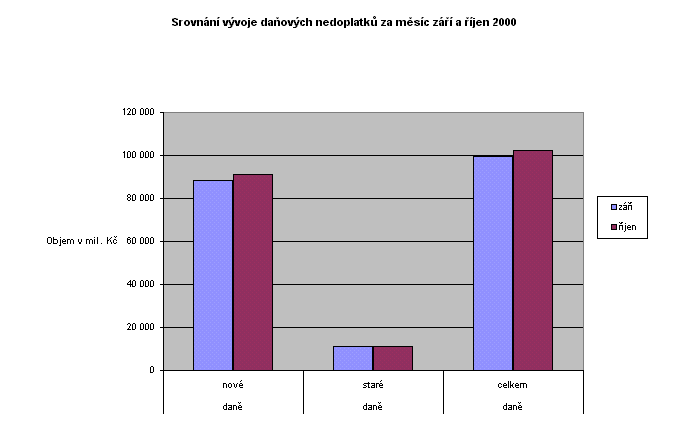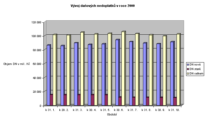 K 31. říjnu 2000 činily daňové nedoplatky evidované územními finančními orgány v České republice 102,2 mld. Kč, přičemž 91,1 mld. Kč připadalo na daně nové daňové soustavy platné od 1. ledna 1993 a 11,1 mld. Kč na daně staré daňové soustavy platné do 31. prosince 1992. Údaje z evidence daní ukazují, že v uplynulém měsíci byl největší nárůst nedoplatků zaznamenán u daní z příjmů (o 1,2 mld. Kč, z toho u daní z příjmů právnických osob o více než 1 mld. Kč), u daně z přidané hodnoty (o 741 mil. Kč) a u spotřebních daní (o 563 mil. Kč).