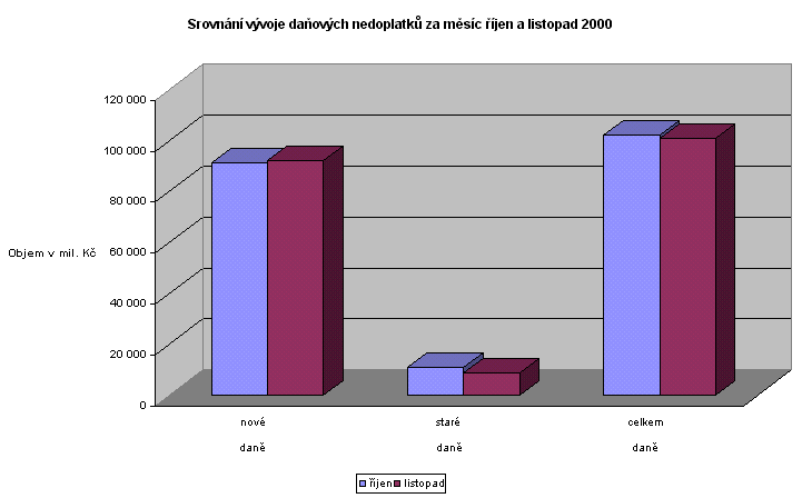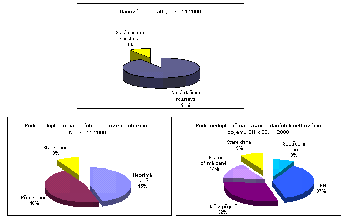 U daní nové daňové soustavy vzrostl objem daňových nedoplatků o 1,1 mld. Kč. Největší nárůst byl zaznamenán u daně z nemovitostí o 474 mil. Kč a u daně z příjmů právnických osob o 247 mil. Kč. Tento vývoj je způsoben především tím, že předpisy u těchto uvedených daní jsou zaúčtovány k 30.11.2000, kdy je stanovena i splatnost daňové povinnosti, avšak u řady daňových subjektů se platby daně, resp. zálohy na daň, uskutečňují až v měsíci v prosinci.