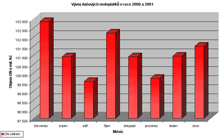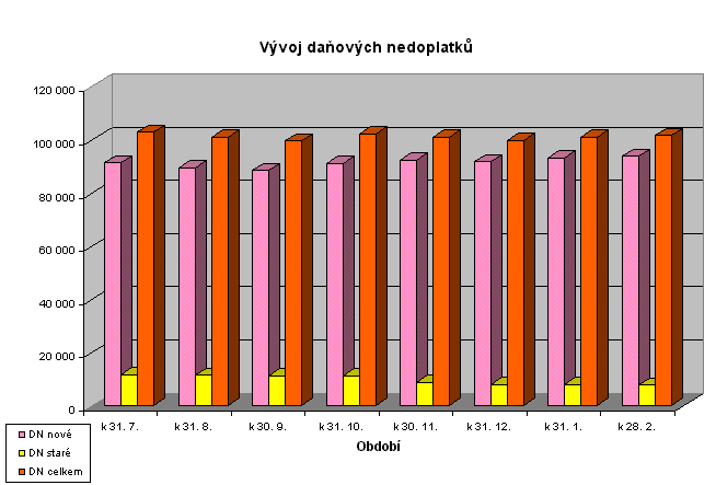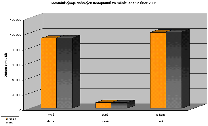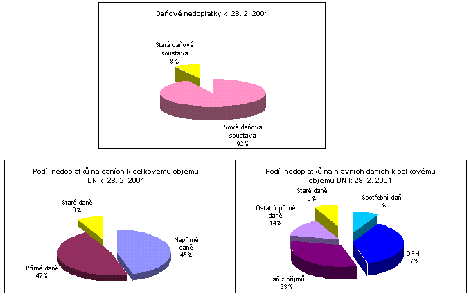 V měsíci únoru nebyly zaznamenány ve vývoji daňových nedoplatků podstatné výkyvy. Celkový objem daňových nedoplatků za Českou republiku vykazovaný územními finančními orgány k 28. 2. 2001 vzrostl proti minulému měsíci jen o 0,5 mdl. Kč a dosáhl výše 101,5 mld. Kč. V rozhodující míře se na této výši podílejí nedoplatky na daních nové daňové soustavy platné od 1. 1. 1993 s objemem 93,7 mld. Kč. Nedoplatky na daních staré daňové soustavy platné do 31. 12. 1992 dosáhly zhruba stejné výše jako v předchozím měsíci, tj. 7,8 mld. Kč. Porovnání s předchozím měsícem ukazuje, že mírně (o cca 0,5 mld. Kč) vzrostly nedoplatky na daních nové daňové soustavy. Nedoplatky na daních staré daňové soustavy opět mírně poklesly o 22 mil. Kč. Z dlouhodobějího pohledu lze hodnocení vývoje daňových nedoplatků v měsíci únoru hodnotit pozitivně, neboť pokračoval příznivý trend poklesu meziročního růstu nedoplatků na daních evidovaných územními finančními orgány. Ve srovnání se stavem k 29. 2. 2000 představuje meziroční nárůst daňových nedoplatků absolutně jen 763 mil. Kč (index II-2001/II-2000 = 1,01).