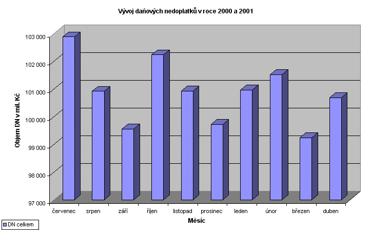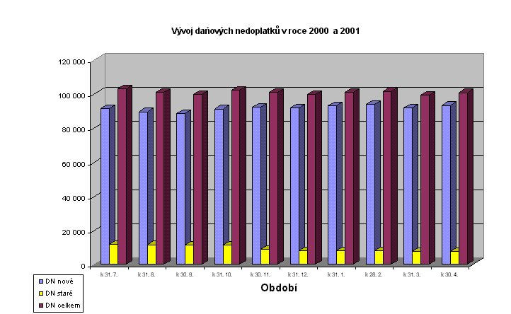 Ve srovnání se stejným obdobím předchozího roku byl i v měsíci dubnu 2001 zaznamenán pokles celkového objemu daňových nedoplatků o 1,6 mld. Kč, když k 30.4. 2000představoval evidovaný objem daňových nedoplatků částku 102,3 mld. Kč. Pokračuje pozitivní vývoj postupného snižování tempa meziročního růstu daňových nedoplatků a v posledních dvou měsících byl dokonce zaznamenán jejich pokles, což dokládají údaje indexového srovnání (index červen 2000/červen 1999 = 1,12; index prosinec 2000/prosinec 1999 = 1,01; index březen 2001/březen 2000 = 0,94; index duben 2001/duben 2000 = 0,98).