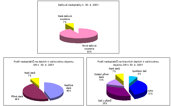 Celkový objem daňových nedoplatků vykazovaný územními finančními orgány k 30.4. 2001 dosáhl výše 100,7 mld. Kč. Z toho 93,2 mld. Kč představují nedoplatky na daních nové daňové soustavy platné od 1.ledna 1993 a 7,5 mld. Kč na daních staré daňové soustavy platné do 31. prosince 1992. Tento vývoj se předpokládal v důsledku mimořádného vlivu vyúčtování daně z příjmů, jak je níže komentováno.