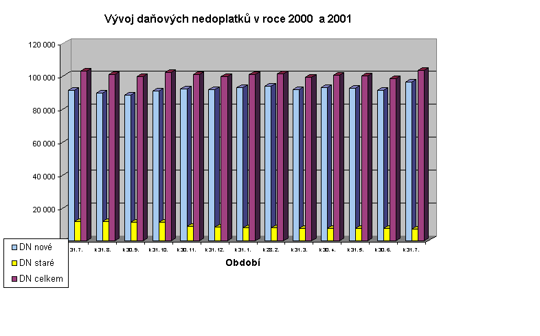 Z hlediska dlouhodobého sledování vývoje daňových nedoplatků nepředstavuje tento nárůst významnější problém. Jedná se pouze o přechodný výkyv, který se projevil zejména u daně přidané hodnoty a u daně z příjmů právnických osob. Vývoj v měsíci červenci t. r. v podstatě nevybočil z dlouhodoběji se projevujícího trendu postupného snižování meziročního růstu daňových nedoplatků a zůstává v relaci s indexy, dosaženými v předchozím období (index červenec 2000/červenec 1999 = 1,18; index prosinec 2000/prosinec 1999 = 1,01; index březen 2001/březen 2000 = 0,94; index červen 2001/červen 2000 = 0,93; index červenec 2001/červenec 2000 = 1,01).
