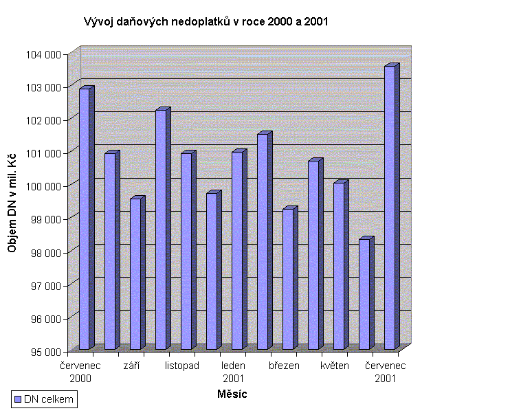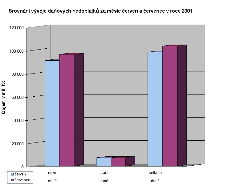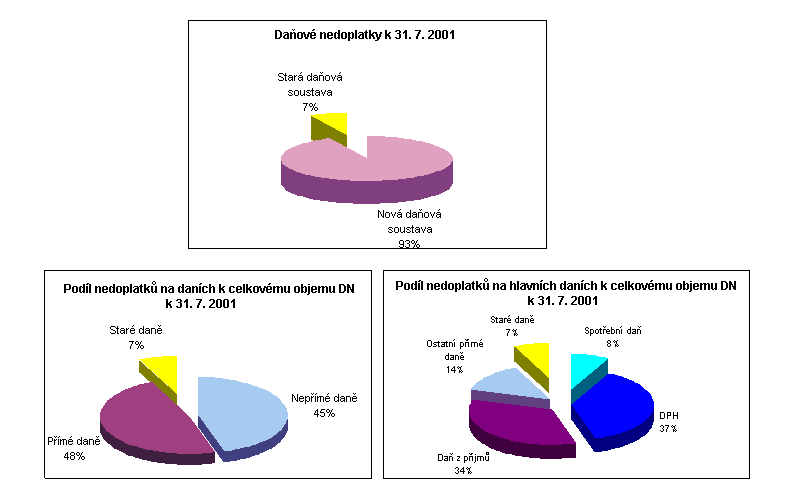 Celkový objem daňových nedoplatků vykazovaný územními finančními orgány k 31.7. 2001 dosáhl výše 103,5 mld. Kč. Z toho 96,4 mld. Kč představují nedoplatky na daních nové daňové soustavy platné od 1.ledna 1993 a 7,1 mld. Kč nedoplatky na daních staré daňové soustavy platné do 31.prosince 1992. Nárůst nedoplatků v měsíci červenci byl zaznamenán jen na daních nové daňové soustavy, a to téměř o 5,3 mld. Kč. Naopak u daní staré daňové soustavy došlo k jejich mírnému poklesu o 71 mil. Kč.