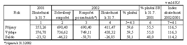Podle bankovních údajů o pokladním plnění státního rozpočtu k 31.7.2002 dosáhly celkové příjmy objemu 411,5 mld Kč, celkové výdaje byly čerpány ve výši 438,3 mld Kč a vykázaný schodek představuje hodnotu -26,8 mld Kč. Proti stejnému období minulého roku (schodek 23,6 mld Kč) byl výsledek horší o 3,3 mld Kč. Schválený státní rozpočet na rok 2002 počítá s objemem celkových příjmů 690,4 mld Kč, celkových výdajů 736,6 mld Kč a se schodkem ve výši -46,2 mld Kč. Výdaje státního rozpočtu na tento rok byly rozpočtovými opatřeními provedenými k 31.3. 2002 zvýšeny celkem o 12,5 mld Kč (z toho 12,1 mld Kč souvisí s úhradou zbývající ztráty KoB za rok 1999 - zákon č. 259/2001 Sb.), takže při nezměněném objemu příjmů se rozpočtovaný schodek zvýšil na 58,7 mld Kč.