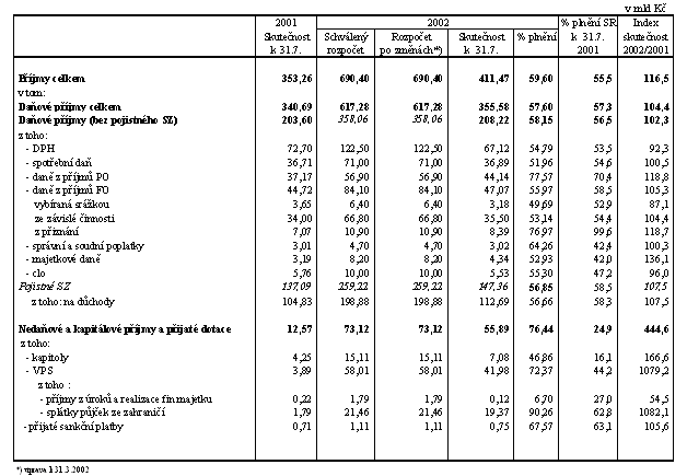 Celostátní inkaso všech daní dosáhlo ke konci července 2002 výše 274,7 mld Kč, což představuje 58,4 % celoročně rozpočtovaného objemu a meziroční přírůstek o 16,2 mld Kč, tj. o 6,3 %. Ve stejném období minulého roku dosáhlo celostátní inkaso daní 258,5 mld Kč, tj. 56,3 % schváleného rozpočtu a meziroční přírůstek 18,2 mld Kč, tj. o 7,6 % (podrobněji viz příloha č. 3).