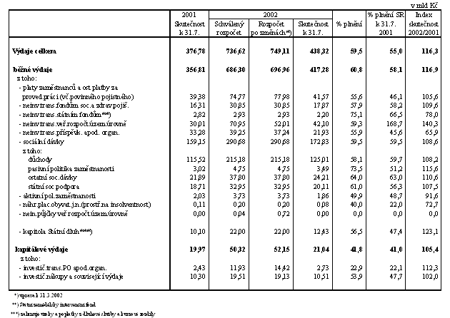 Celkové výdaje státního rozpočtu za sedm měsíců letošního roku ve výši 438,3 mld Kč představovaly 59,5 % ročního rozpočtu, což je vyšší úroveň než v roce 2001 (55,0 % rozpočtu) a byly mírně nad úrovní alikvoty upraveného rozpočtu (o 1,3 mld Kč). Meziročně se zvýšily o 61,5 mld Kč, tj. o 16,3 %.