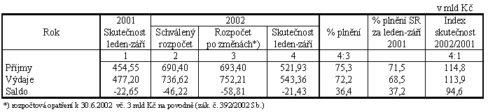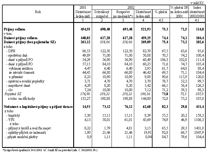 Celkové příjmy dosáhly k 30.9.2002 objemu 521,9 mld Kč a celkové výdaje byly čerpány ve výši 543,3 mld Kč a schodek činil -21,4 mld Kč.