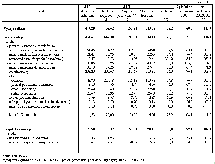 Celkové výdaje státního rozpočtu za devět měsíců letošního roku ve výši 543,3 mld Kč představují 72,2 % upraveného rozpočtu (ve stejném období m.r. činilo čerpání výdajů 68,5 % upraveného rozpočtu) a za alikvotou zaostávají o 10,8 mld Kč (v roce 2001 o 45,5 mld Kč). Jejich meziroční růst činí 13,9 % (tj. absolutně 66,2 mld Kč), když upravený rozpočet počítá s růstem 7,9 % proti skutečnosti roku 2001.