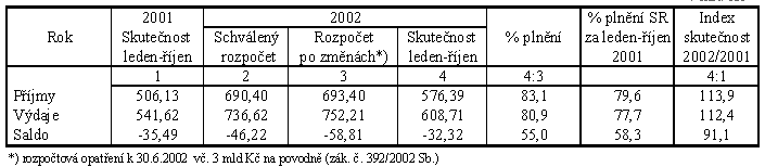 Podle bankovních údajů o pokladním plnění vykazuje hospodaření státního rozpočtu ke konci října 2002 schodek ve výši 32,3 mld Kč, když celkové příjmy dosáhly výše 576,4 mld Kč (83,5 % schváleného rozpočtu) a celkové výdaje byly čerpány v objemu 608,7 mld Kč (82,6 % schváleného rozpočtu). Desítiměsíční alikvotě zákonem č. 490/2001 Sb. schváleného celoročního schodku (-46,2 mld Kč) odpovídá převaha výdajů nad příjmy ve výši -38,5 mld Kč. Skutečně vykázaný schodek je tak proti alikvotě nižší o 6,2 mld Kč. Proti schodku vykázanému ke konci září ve výši -21,4 mld Kč, došlo ke zhoršení salda o 10,9 mld Kč.