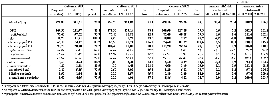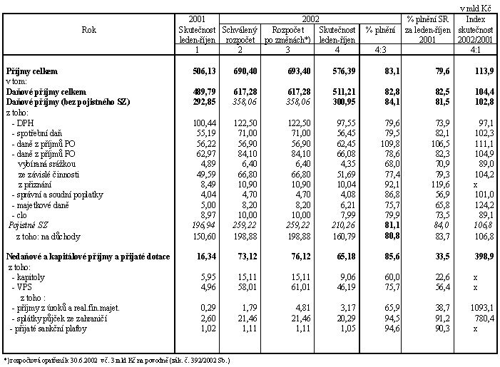 Za celé období ledna až října se hospodaření státního rozpočtu vyvíjí relativně příznivě. Při meziročním růstu celkových příjmů o 13,9 % (schválený rozpočet počítá s růstem 10,2 % proti skutečnosti roku 2001) vzrostly daňové příjmy vč. pojistného na sociální zabezpečení o 4,4 % (rozpočet počítá s růstem o 3,1 %) a nedaňové, kapitálové a ostatní příjmy téměř na trojnásobek, což odpovídá záměrům upraveného rozpočtu (růst o 279 %) a souvisí s již zmiňovanými mimořádnými příjmy.