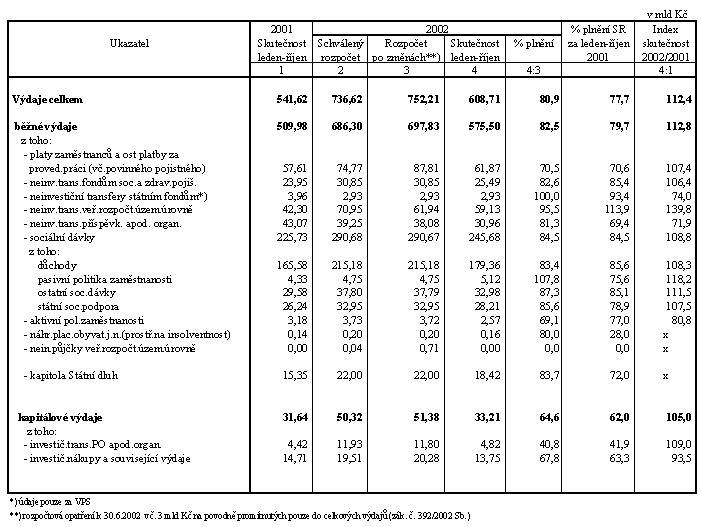 Celkové výdaje státního rozpočtu za deset měsíců letošního roku ve výši 608,7 mld Kč představují 80,9 % upraveného rozpočtu (ve stejném období m.r. činilo čerpání výdajů 77,7 % upraveného rozpočtu) a za alikvotou zaostávají o 18,1 mld Kč (v roce 2001 o 39,2 mld Kč). Jejich meziroční růst dosáhl 12,4 %, absolutně 67,1 mld Kč. Nad úrovní rozpočtované alikvoty jsou čerpány zejména neinvestiční transfery veřejným rozpočtům územní úrovně a výdaje na sociální dávky (vyšší čerpání státní sociální podpory, nemocenských dávek a pasivní politiky zaměstnanosti).