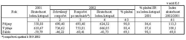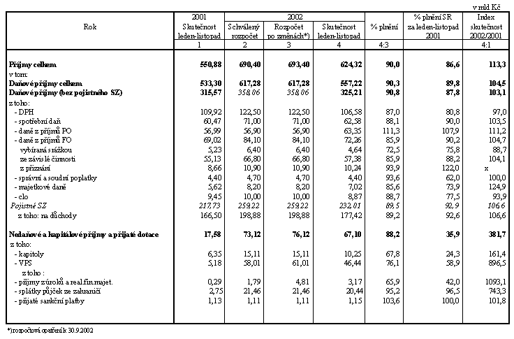 Za celé období ledna až listopadu se hospodaření státního rozpočtu ve srovnání s upraveným rozpočtem vyvíjí relativně příznivě. Při meziročním růstu celkových příjmů o 13,3 % (schválený rozpočet počítá s růstem 10,2 % proti skutečnosti roku 2001) lze pozitivně hodnotit zejména inkaso příjmů z daní a poplatků (plnění celoročního rozpočtu na 90,8 % proti 87,8 % ve stejném období minulého roku) a nedaňové, kapitálové a ostatní příjmy, které jsou plněny výrazně lépe než ke konci loňského listopadu (na 88,2 % proti 35,9 %).