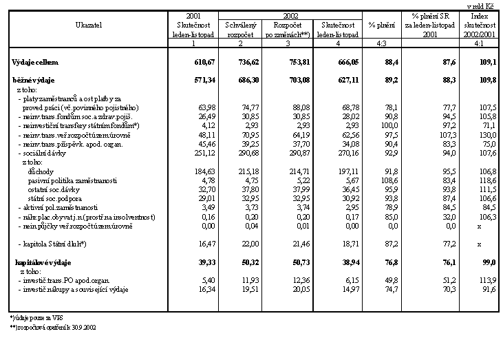 Celkové výdaje státního rozpočtu ke konci listopadu dosáhly výše 666,0 mld Kč, což představuje 88,4 % upraveného rozpočtu (ve stejném období m.r. činilo jejich čerpání 87,6 %) a za alikvotou zaostávají o 24,9 mld Kč (v roce 2001 o 28,2 mld Kč). Jejich meziroční růst dosáhl 109,1 %, absolutně 55,4 mld Kč. Nad úrovní rozpočtované alikvoty jsou čerpány zejména neinvestiční transfery veřejným rozpočtům územní úrovně a výdaje na sociální dávky (vyšší čerpání důchodů, státní sociální podpory, nemocenských dávek a pasivní politiky zaměstnanosti).