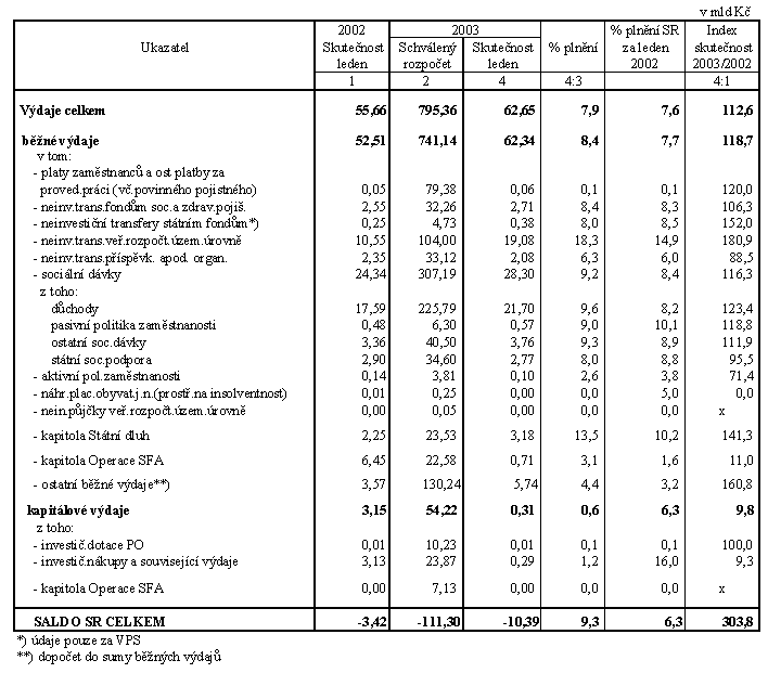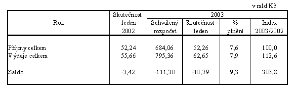 Ve srovnání se stejným obdobím loňského roku jsou ke konci ledna 2003 příjmy zhruba na stejné úrovni, výdaje o 7,0 mld Kč, tj. o 12,6 % vyšší.