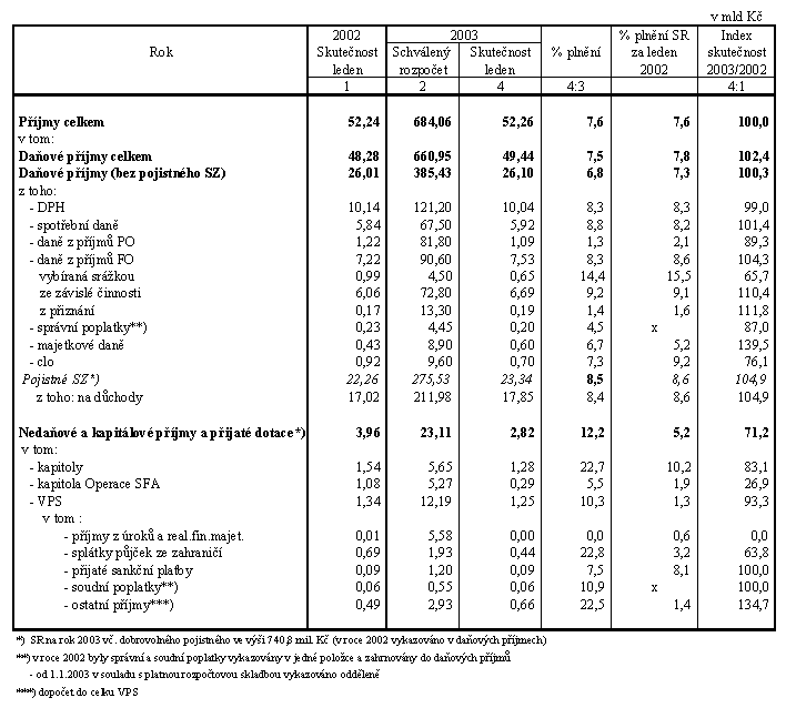 Dosažené příjmy 52,3 mld Kč představují 7,6 % předpokládaného ročního úkolu, což odpovídá úrovni předchozích let, kdy se podíl ledna pohyboval v rozmezí od 7,4 % do 9,3 % roční skutečnosti. Ve vztahu k měsíční alikvotě celoročního rozpočtu jsou celkové příjmy nižší o 4,7 mld Kč. Projevuje se zde zatím nižší plnění daňových příjmů (výpadek proti alikvotě -6,0 mld Kč), zatímco nedaňové a kapitálové příjmy jsou mírně nad úrovní lednové alikvoty.