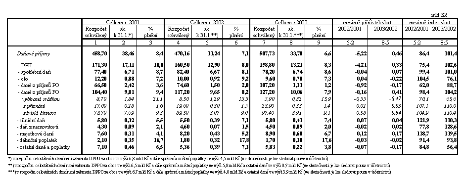 Celostátní inkaso všech daní dosáhlo k 31.1. 2003 výše 33,7 mld Kč, což představuje 6,6 % celoročně rozpočtovaného objemu při meziročním růstu o 0,5 mld Kč, tj. o 1,4 %. Ve stejném období minulého roku dosáhlo celostátní inkaso daní 33,2 mld Kč, tj. 7,1 % schváleného rozpočtu a meziroční pokles o 5,2 mld Kč, tj. o 13,6 % (podrobněji viz příloha č. 3).
