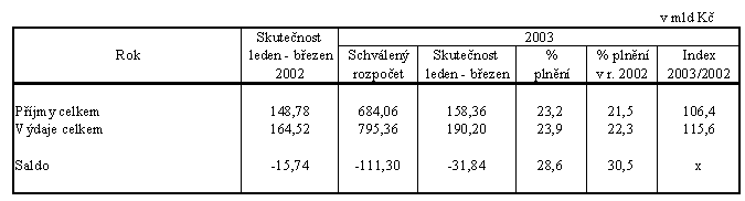Z údajů o pokladním plnění státního rozpočtu vykázaných bankou ke konci března roku 2003 vyplývá převaha výdajů státního rozpočtu nad jeho příjmy o 31,8 mld Kč. Proti stejnému období loňského roku jsou ke konci března 2003 příjmy o 9,6 mld Kč, tj. o 6,4 % vyšší, výdaje o 25,7 mld Kč, tj. o 15,6 % vyšší a saldo o 16,1 mld Kč horší.