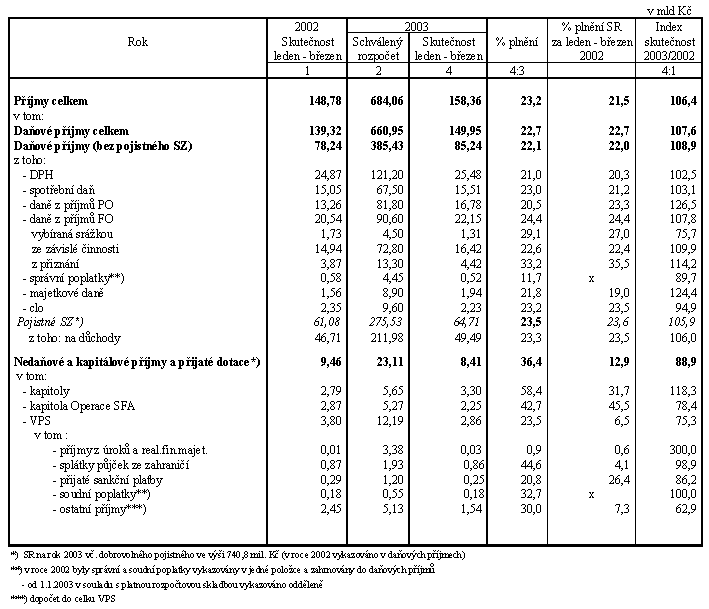 Proti čtvrtinové alikvotě celoročního rozpočtu zaostávají celkové příjmy o 12,7 mld Kč (v 1. čtvrtletí 2002 činil výpadek 23,8 mld Kč) z toho daňové příjmy o 11,1 mld Kč (v loňském roce o 10,7 mld Kč), pojistné na SZ o 4,2 mld Kč (v roce 2002 o 3,7 mld Kč), ostatní příjmy jsou nad alikvotou o 2,6 mld Kč (v roce 2002 byly naopak pod alikvotou o 9,4 mld Kč).
