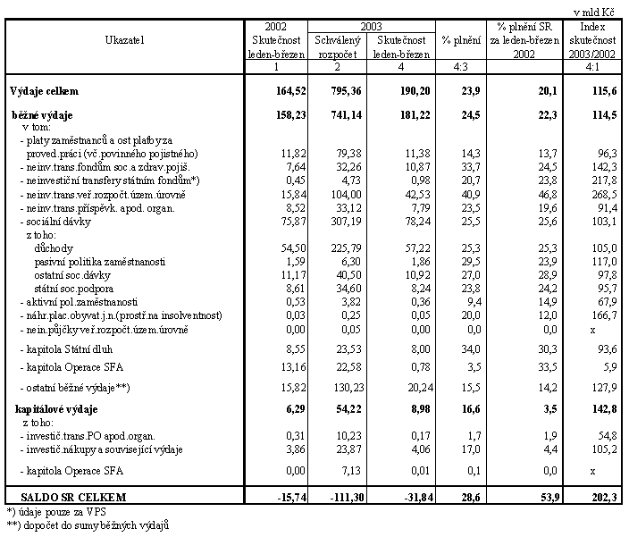 Proti alikvotní částce celoročního rozpočtu je čerpání celkových výdajů státního rozpočtu sice o 8,6 mld Kč nižší (v roce 2002 o 19,6 mld Kč), ale proti k loňské skutečnosti došlo k nárůstu o 25,7 mld Kč, což se projevilo ve výsledném saldu příjmů a výdajů státního rozpočtu za 1. čtvrtletí letošního roku (-31,8 mld Kč), které převyšuje alikvotu celoroku o 4,0 mld Kč.