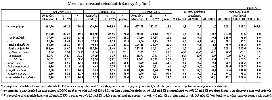 Celostátní inkaso všech daní dosáhlo k 31.3. 2003 výše 111,0 mld Kč, což představuje 21,9 % celoročně rozpočtovaného objemu a meziroční nárůst o 8,0 mld Kč, tj. o 7,8 %. Ve stejném období minulého roku dosáhlo celostátní inkaso daní 103,0 mld Kč, tj. 21,9 % schváleného rozpočtu a meziroční přírůstek 7,7 mld Kč, tj. 8,1 %.