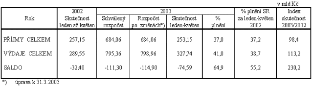 Hospodaření státního rozpočtu za leden až květen 2003 skončilo schodkem ve výši -74,6 mld Kč, když podle údajů na účtech Ministerstva financí vedených v ČNB dosáhly celkové příjmy státního rozpočtu výše 253,2 mld Kč a výdaje byly čerpány v objemu 327,7 mld Kč