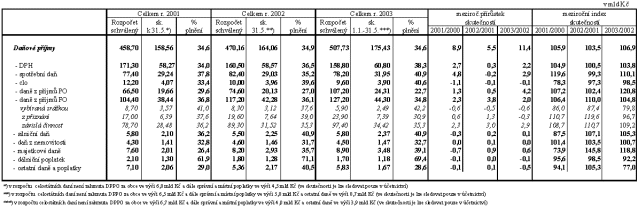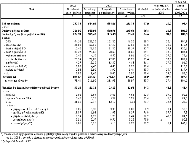 Proti pětiměsíční alikvotě celoročního rozpočtu zaostávají celkové příjmy o 31,9 mld Kč (ve stejném období roku 2002 činil výpadek -30,5 mld Kč) z toho daňové příjmy o 27,2 mld Kč (v roce 2002 o -24,8 mld Kč), pojistné na SZ o 7,6 mld Kč (v roce 2002 o -5,4 mld Kč), zatímco ostatní příjmy jsou nad alikvotou o 2,9 mld Kč (v roce 2002 byly na úrovni alikvoty).