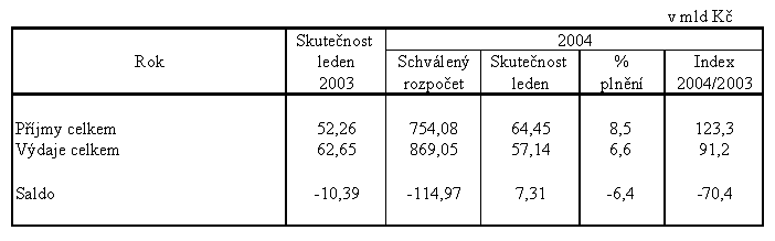 Podle bankovních údajů o pokladním plnění státního rozpočtu ke konci ledna 2004 vykazuje státní rozpočet přebytek ve výši 7,3 mld Kč, zatímco v roce 2003 činil lednový schodek 10,4 mld Kč.