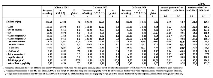 Rozpočtované celostátní inkaso daní na rok 2004 (bez DPPO za obce, správních a místních poplatků a ostatních daní) ve výši 553,4 mld Kč je proti schválenému rozpočtu na rok 2003 vyšší o 45,7 mld Kč, tj. o 9,0 %. Objemově je nejvyšší růst rozpočtován u spotřebních daní 18,8 mld Kč (124,0 %), DPH 16,0 mld Kč (110,1 %), vysokou meziroční dynamiku mají majetkové daně (60,7 %), i když jejich podíl na celku je jen cca 2,5 %.
