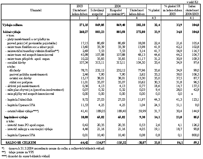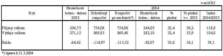 Ve srovnání s výsledky za leden až březen (schodek -7,8 mld Kč) se v samotném měsíci dubnu hospodaření státního rozpočtu zhoršilo, když výdaje vynaložené v tomto měsíci převýšily příjmy o 30,2 mld Kč (loni činilo toto převýšení 32,6 mld Kč). Zvýšení záporného salda ovlivnila platba příspěvku státu stavebním spořitelnám za rok 2003 ve výši 14,8 mld Kč, dále další transfery krajům v objemu 3,5 mld Kč a nově převod vlastních zdrojů ČR z DPH a z hrubého národního důchodu ve prospěch Evropské unie ve výši 2,0 mld Kč.