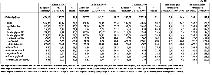 Slibně se i nadále vyvíjí inkaso nepřímých daní, tj. DPH a spotřebních daní - to dosáhlo výše 77,2 mld Kč, tj. 35,5 % rozpočtu a je tak nad úrovní 1/3 celoročního rozpočtu o 4,7 mld Kč (v roce 2003 bylo naopak pod jeho úrovní o 2,7 mld Kč, přičemž celoročně ji převýšilo o 9,7 mld Kč). Rovněž výrazně vyšší meziroční růst těchto daní (o 17,0 mld Kč, tj. o 28,2 %) proti dynamice vykázané v loňském roce (+2,4 mld Kč, tj. +4,2 %) i proti rozpočtované dynamice (+15,3 %) signalizuje možnost výrazného překročení celoročního rozpočtu.