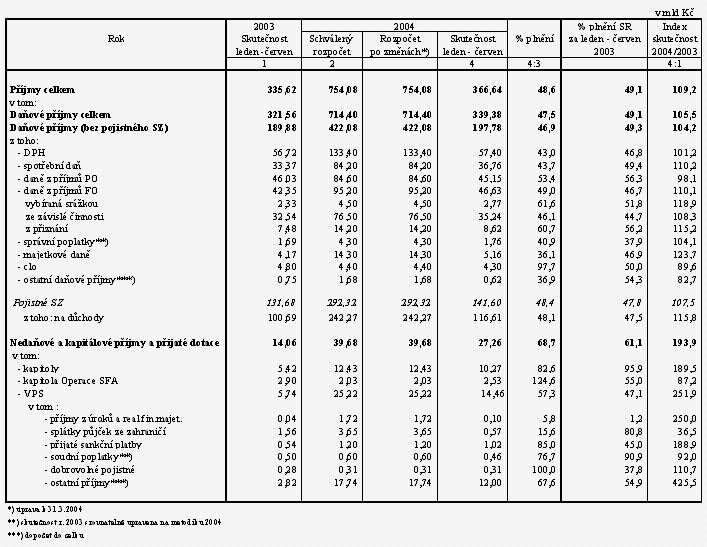 Za 6 měsíců letošního roku připlynulo do státního rozpočtu celkem 366,6 mld Kč, což představuje 48,6 % rozpočtu a meziroční růst o 31,0 mld Kč, tj. o 9,2 %, zatímco v 1. pololetí 2003 byl rozpočet příjmů plněn na 49,1 % při meziročním poklesu inkasa o 12,9 mld Kč, tj. o 3,7 % (vliv vyloučení mimořádných příjmů v roce 2003 při jejich zahrnutí v roce 2002). Proti výsledkům ke konci května se tak červnové inkaso příjmů znatelně zlepšilo (o téměř 20 mld Kč), když dosáhlo výše 77,2 mld Kč proti měsíčnímu průměru za předchozích 5 měsíců ve výši 57,9 mld Kč. Tím se snížilo jejich zaostávání za alikvotou celoročního rozpočtu z 24,8 mld Kč ke konci května na 10,4 mld Kč ke konci června.