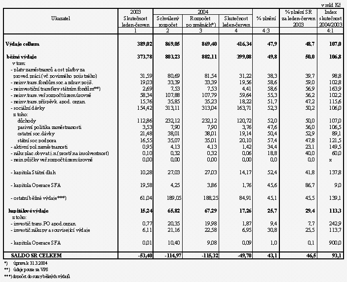 Celkové výdaje státního rozpočtu za 1. pololetí ve výši 416,3 mld Kč představují 47,9 % upraveného rozpočtu, což je nižší plnění než v roce 2003 (48,7 %) a proti alikvotě upraveného rozpočtu tak bylo zatím čerpáno o 18,4 mld Kč méně.