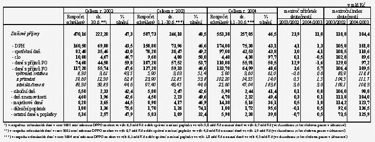 Celostátní inkaso všech daní dosáhlo ke konci června 2004 výše 257,0 mld Kč, což představuje 46,5 % celoročně rozpočtovaného objemu a meziroční přírůstek o 11,0 mld Kč, tj. o 4,4 %. Ve stejném období minulého roku dosáhlo celostátní inkaso daní 246,1 mld Kč, tj. 48,5 % schváleného rozpočtu a meziroční přírůstek 23,9 mld Kč, tj. o 10,8 % (podrobněji viz příloha č. 3).