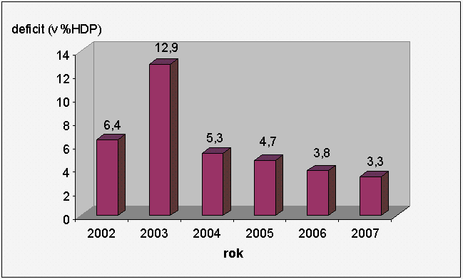 Graf 1: Vývoj deficitu veřejných financí v evropské metodice jako % HDP v letech 2002-2007