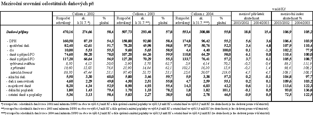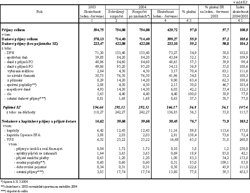 Celostátní inkaso všech daní (tj. plynoucích jak do státního rozpočtu, tak do územních rozpočtů a SFDI) dosáhlo ke konci července 2004 výše 308,9 mld Kč, což představuje 55,8 % celoročně rozpočtovaného objemu a meziroční přírůstek o 15,4 mld Kč, tj. o 5,2 % (rozpočet proti dosažené skutečnosti roku 2003 počítá s růstem 4,4 %). Ve stejném období minulého roku dosáhlo celostátní inkaso daní 293,5 mld Kč, tj. 57,8 % schváleného rozpočtu a meziroční přírůstek 18,8 mld Kč, tj. 6,9 % (podrobněji viz příloha).