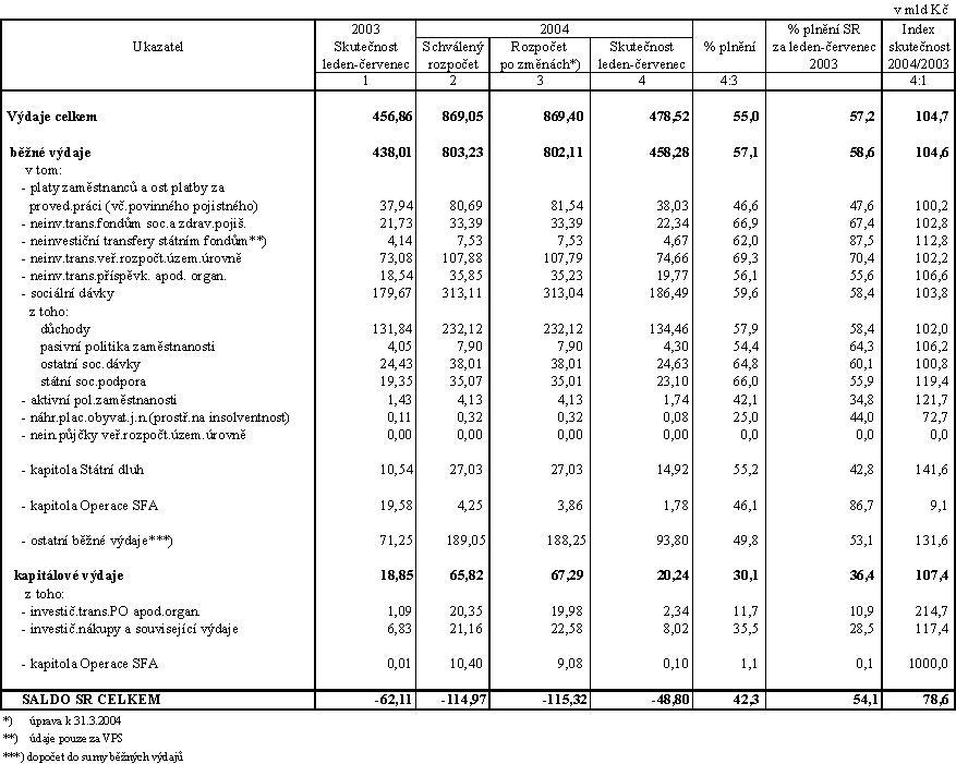 Celkové výdaje státního rozpočtu za sedm měsíců letošního roku ve výši 478,5 mld Kč představují 55,0 % rozpočtu, což je nižší plnění než v roce 2003 (57,2 %) a proti odpovídající alikvotě tak bylo zatím čerpáno o 28,6 mld Kč méně.