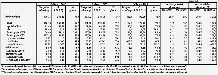 Celkové příjmy státního rozpočtu za devět měsíců ve výši 559,3 mld Kč představují 74,2 % upraveného rozpočtu, což je v podstatě na úrovni loňského roku (plnění na 74,4 %), kdy výsledné celoroční příjmy převýšily rozpočet o 13,6 mld Kč, tj o 2,0 %. Jejich meziroční růst o 9,6 % převyšuje dynamiku schváleného rozpočtu (7,8 % proti skutečnosti 2003) o 1,8 procentního bodu.