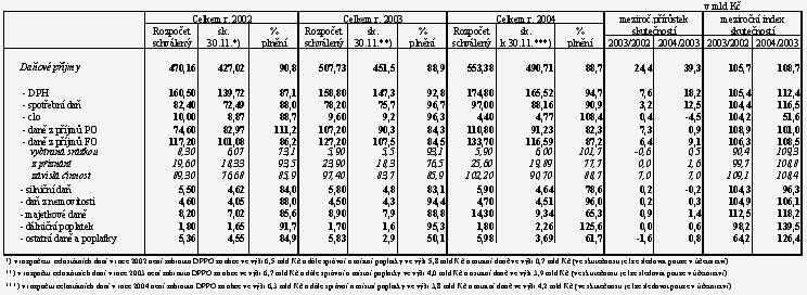 Uspokojivě se vyvíjí i inkaso daně z příjmů právnických osob (DPPO). To dosáhlo výše 69,6 mld Kč, což představuje 82,3 % rozpočtu a meziroční růst o 1,0 % (rozpočet počítá s růstem o 3,0 % proti skutečnosti 2003). I když je letošní plnění pod úrovní loňského roku (o 2,0 procentního bodu), lze i letos očekávat překročení schváleného rozpočtu (v loňském roce bylo celoroční inkaso nad úrovní rozpočtu o 2,5 mld Kč).