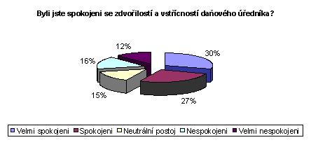 Druhá otázka, která směřovala na zdvořilost a vstřícnost daňového úředníka, vykazuje pozitivní postoj daňových subjektů. Jedna třetina respondentů je velmi spokojena a dalších 27 % respondentů spokojena s interpersonálním přístupem daňových úředníků k daňovým subjektům.