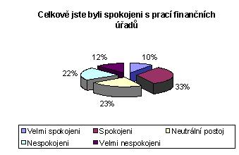 Výsledek na poslední otázku ohledně celkové spokojenosti s prací finančních úřadů je velmi pozitivní pro ÚFO. 43 % respondentů odpovědělo, že jsou celkově spokojeni. Nespokojení a velmi nespokojení tvoří třetinu všech odpovědí. Cílem české daňové správy je přesvědčit nespokojené a nerozhodné daňové subjekty, aby změnili svou představu na činnosti ÚFO.